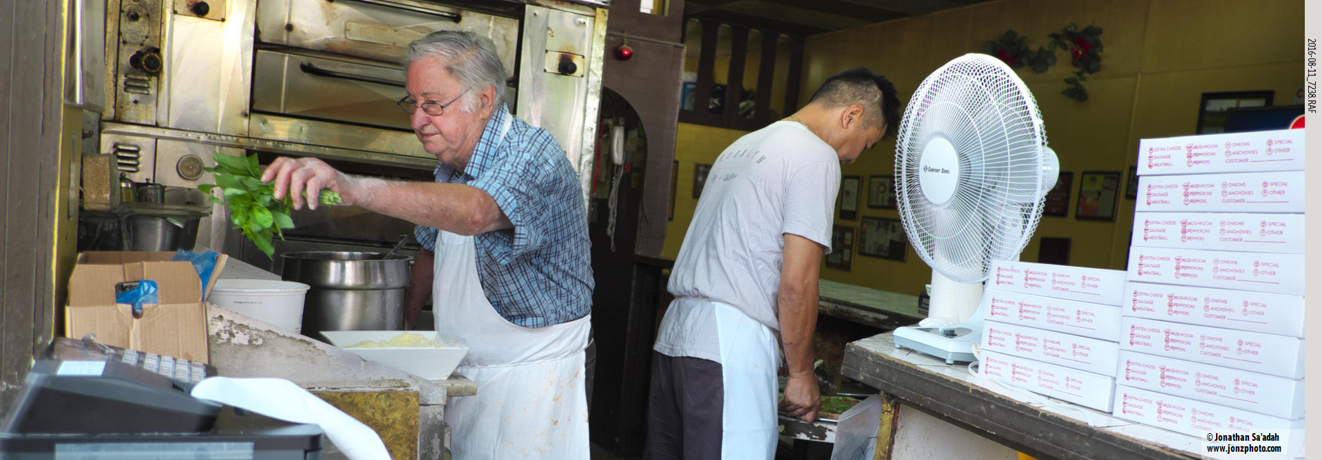 Domenico DeMarco arrived from the Province of Caserta in 1959 and opened his Brooklyn pizzeria in 1965, making pizzas personally by hand for over fifty years. He became a touchstone to younger chefs because of his unwavering commitment to quality. In spite of the recognition, he never stepped out of his working-class background. He died in 2022. I took this picture in 2016.