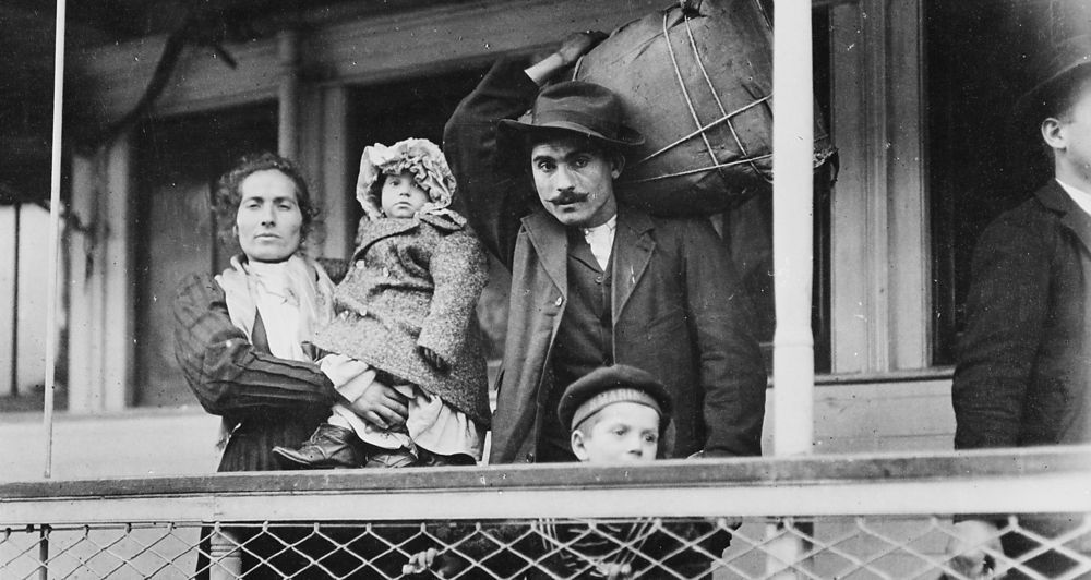 Italian immigrant family on ferry, leaving Ellis Island. (Credit: Lewis Hine, US Library of Congress)
