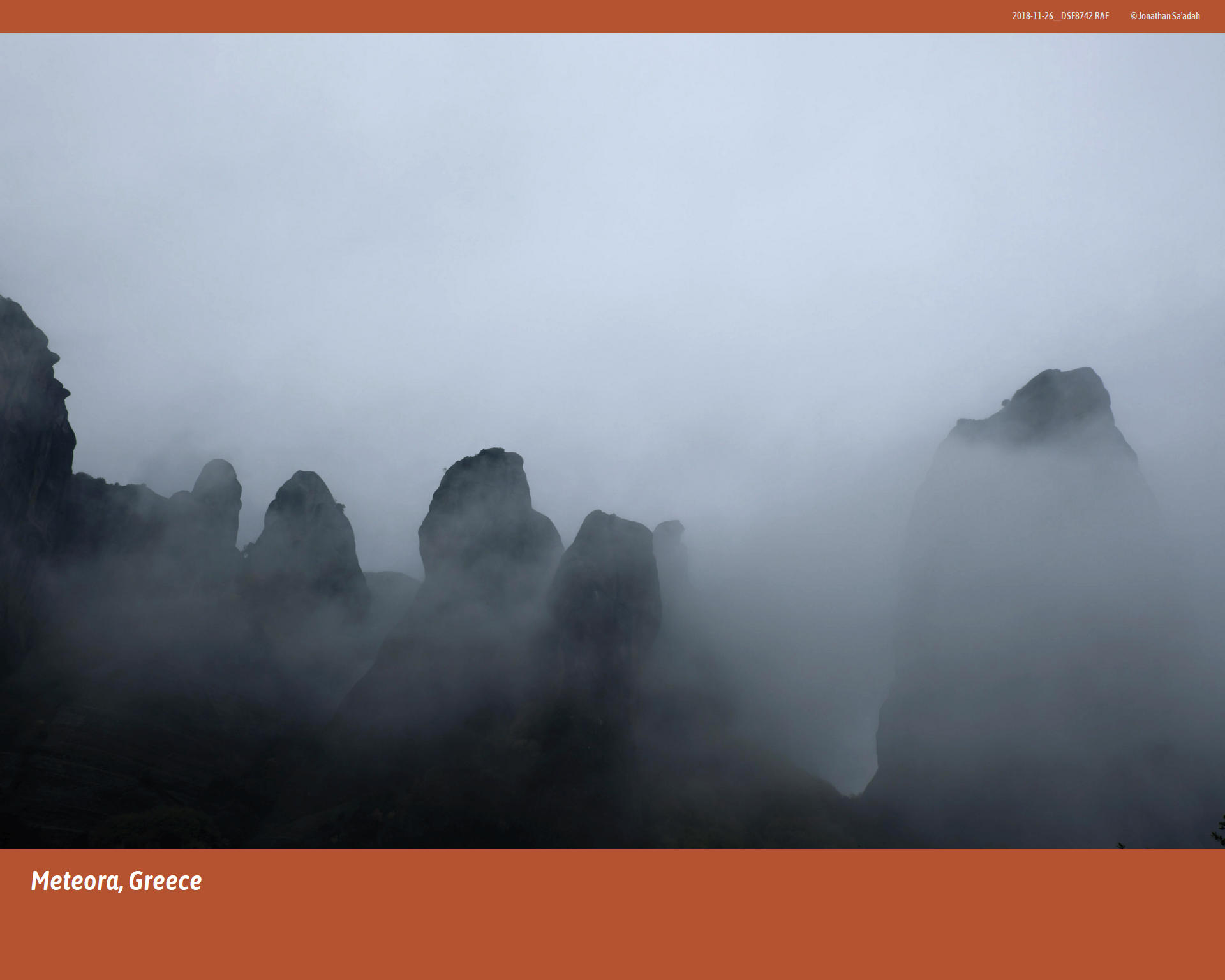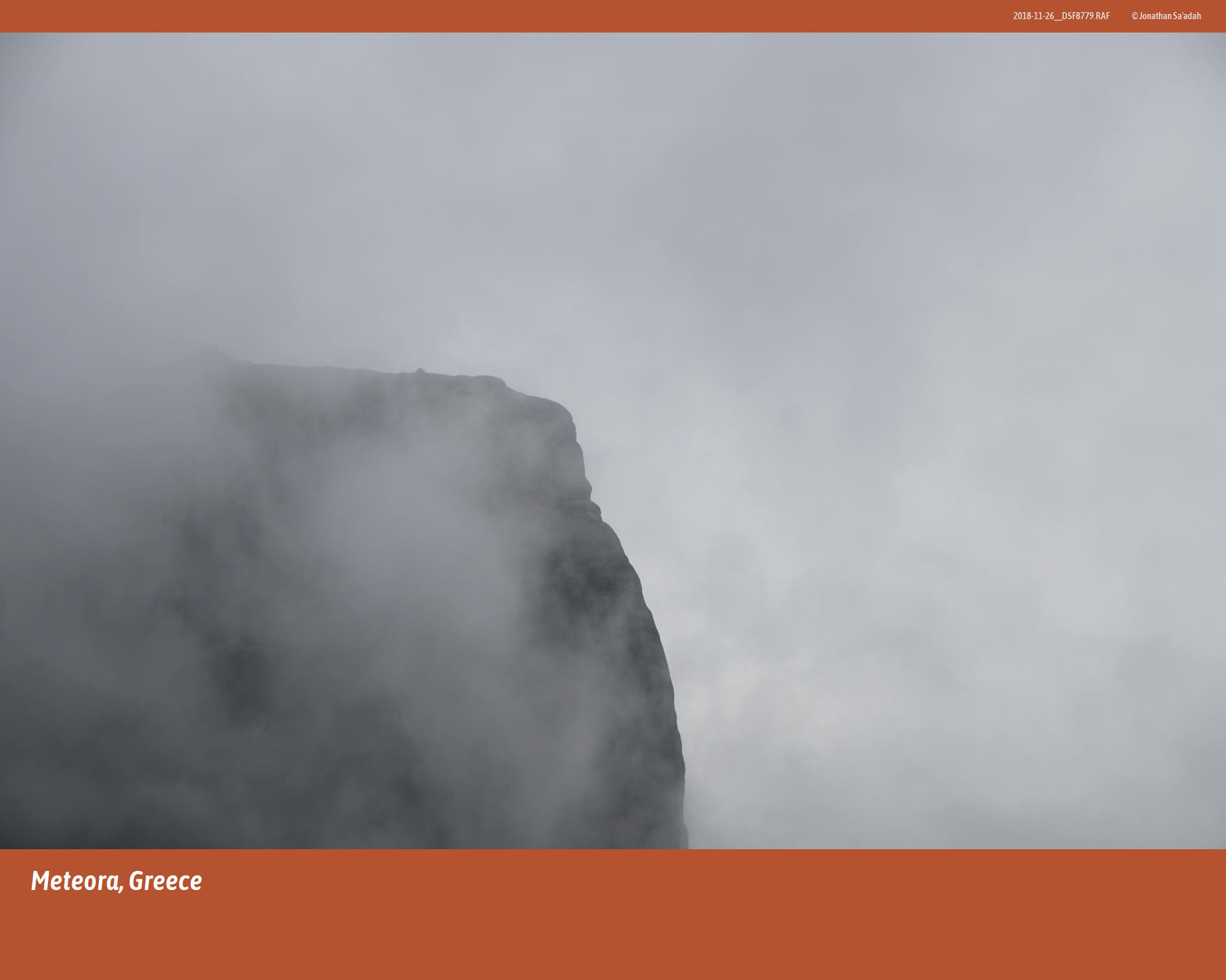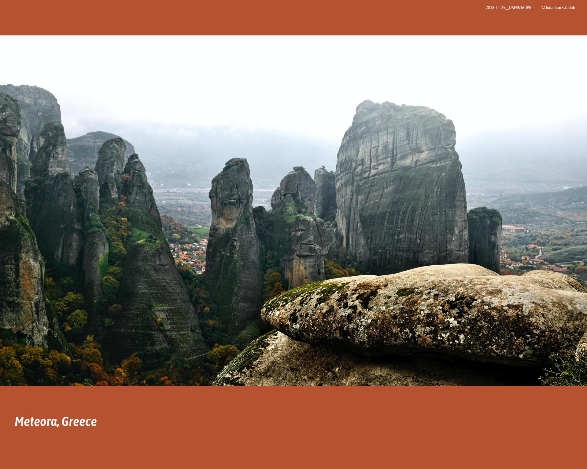 We had come to see Meteora on a misty morning in November, 2018. The ground-hugging fog drifted like a low cloud across the Thessalian plain, swallowing the road ahead and the hulking silhouettes of rock that we knew were there but could not yet see. Somewhere above, the monasteries of Meteora – “suspended in the air,” as their name has been translated for centuries – waited in the whiteout, as they have since the first hermits began climbing into caves up there in the 11th century.