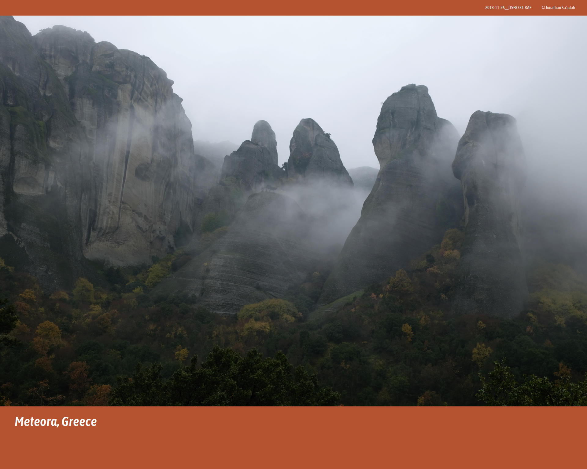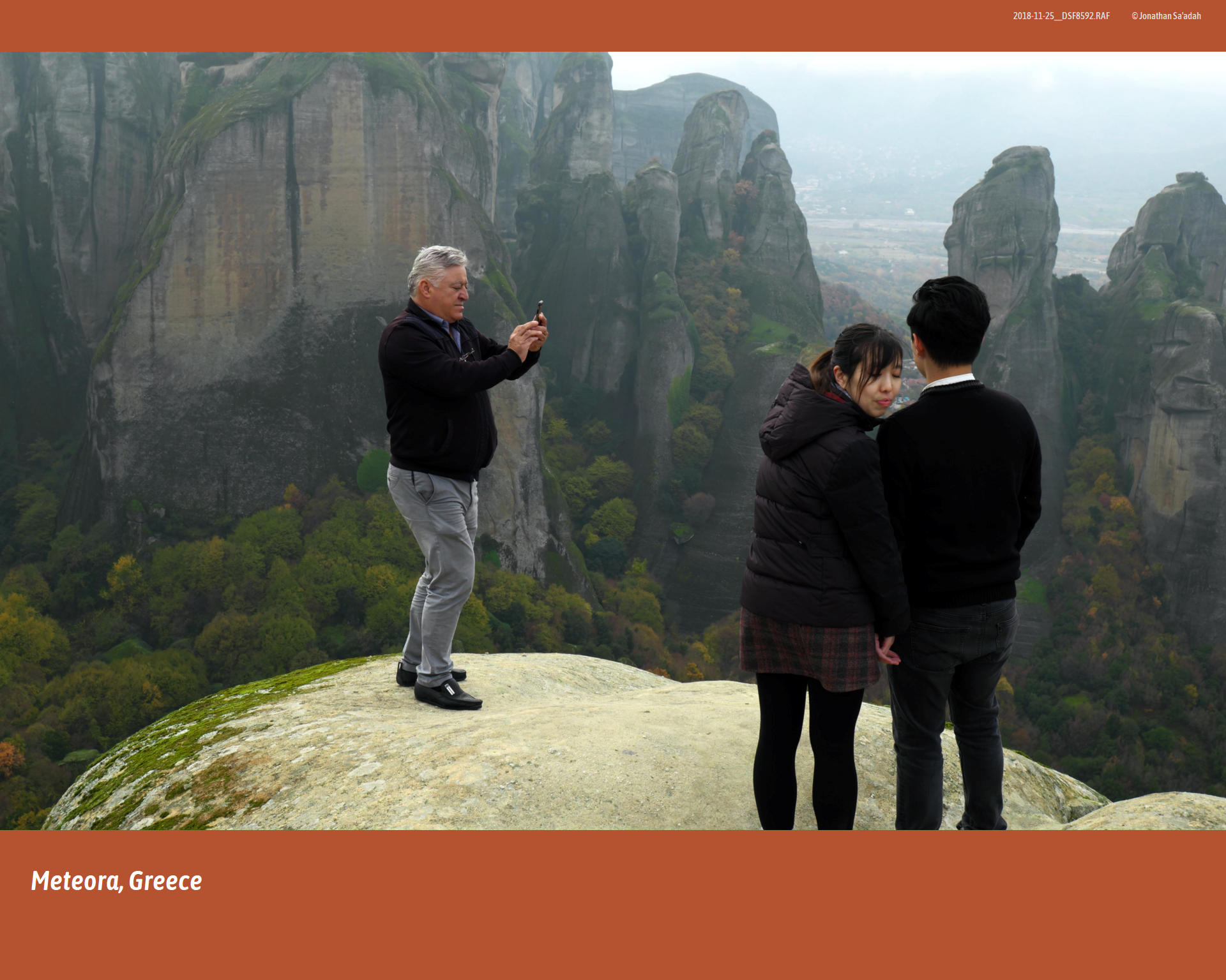 As we moved along the viewpoints that early morning, each gap in the fog offered a new alignment of rock, monastery, and forest, a sequence of tableaux that seemed staged by the weather itself. Looking out across the chasm to another monastery perched on its own pillar, it was possible to imagine the first hermits edging out of their caves at dawn, watching mist lift from this same plain and reading it as a sign – of judgment, of mercy, of simple passing time – in a landscape that felt charged with meaning. Today, buses replace mules and carved stairways replace rope ladders, but the choreography of fog and light still resists domestication; for a few minutes on that November day, the cliffs and their glowing trees belonged less to the age of mass tourism than to the long, solitary devotion that first drew human beings to live in the air.
